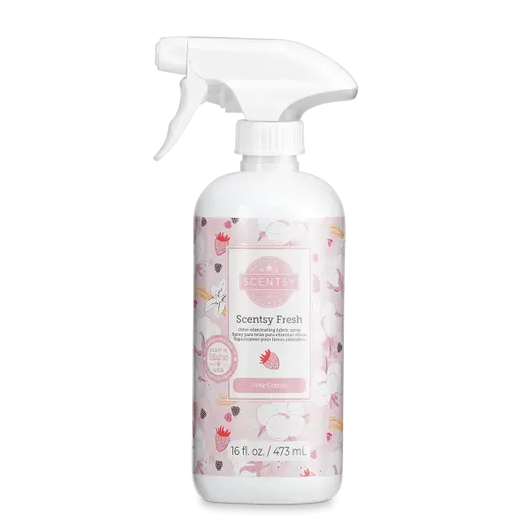 Scentsy Pink Cotton Fabric Spray – Find your fantasy on a cloud of clean cotton swirled with fruity pink berries and vanilla sugar.