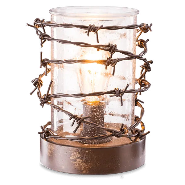 Faux, double-twisted barbed wire encircles an old-fashioned hurricane lamp with a wrought iron base — perfect after a long day working on the open range.