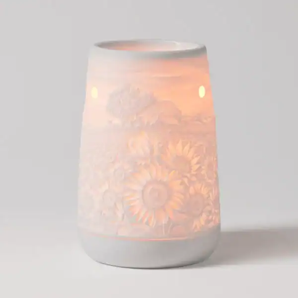 Sunflower Fields Scentsy Warmer – Bring a burst of sunny warmth into your home with the Sunflower Fields Scentsy Warmer. Crafted using a delicate lithophane technique, this standout piece renders a mesmerizing, photo-real sunflower scene that glows beautifully from every angle—almost like sunlight has been captured inside ceramic petals.