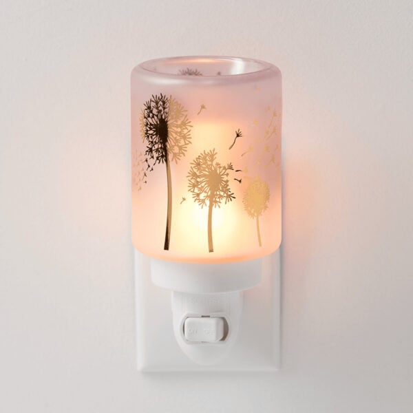 Wishbloom Scentsy Mini Warmer – Golden dandelions adorn frosted glass, bringing fragrant wishes to life.