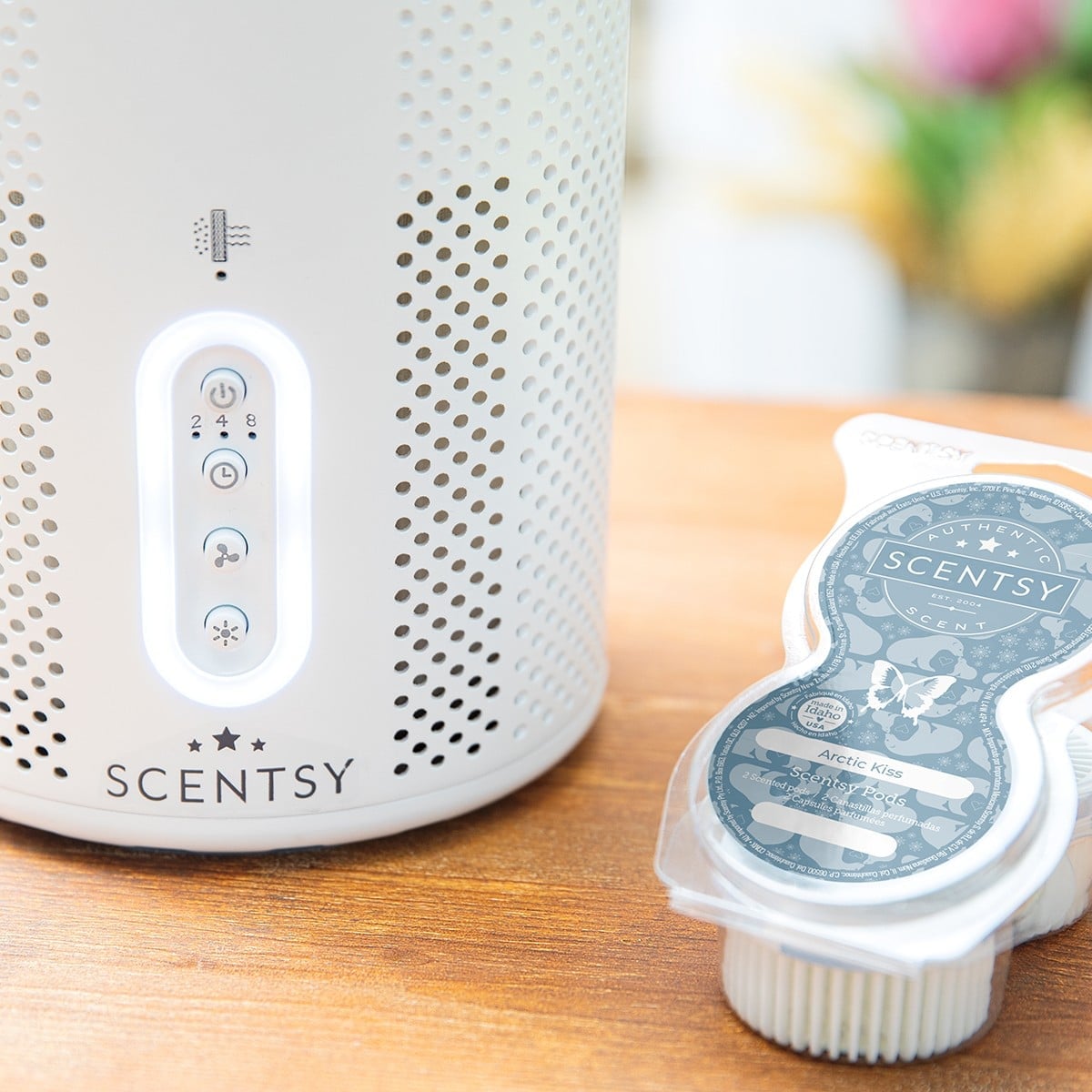 The Air Purifier is designed to be used with Scentsy Pods and can hold up to two pods at a time. As the unit releases clean air back into your environment, the air flows through the Scentsy Pods to fill your space with fragrance.