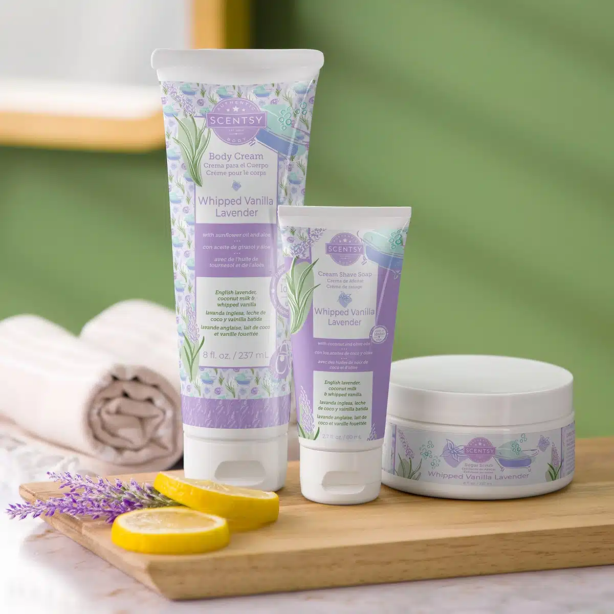 Includes Scentsy Body Cream, Cream Shave Soap and Sugar Scrub in our new Whipped Vanilla Lavender fragrance. - Etched Core – Rose Gold Warmer + any two Spring/Summer 2022 Scentsy Bars