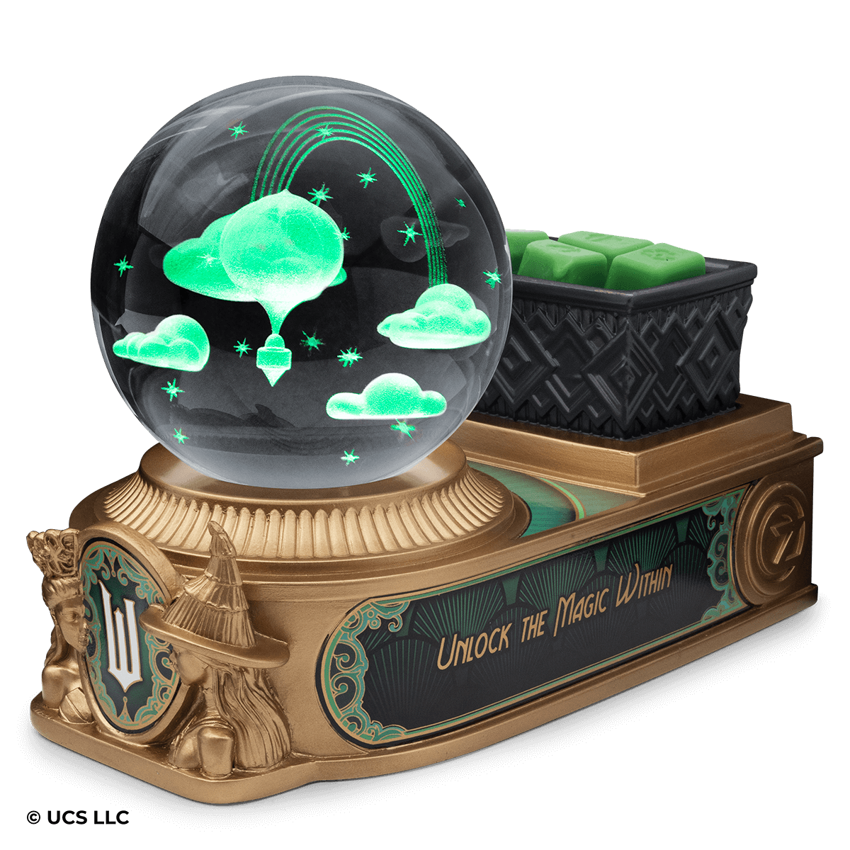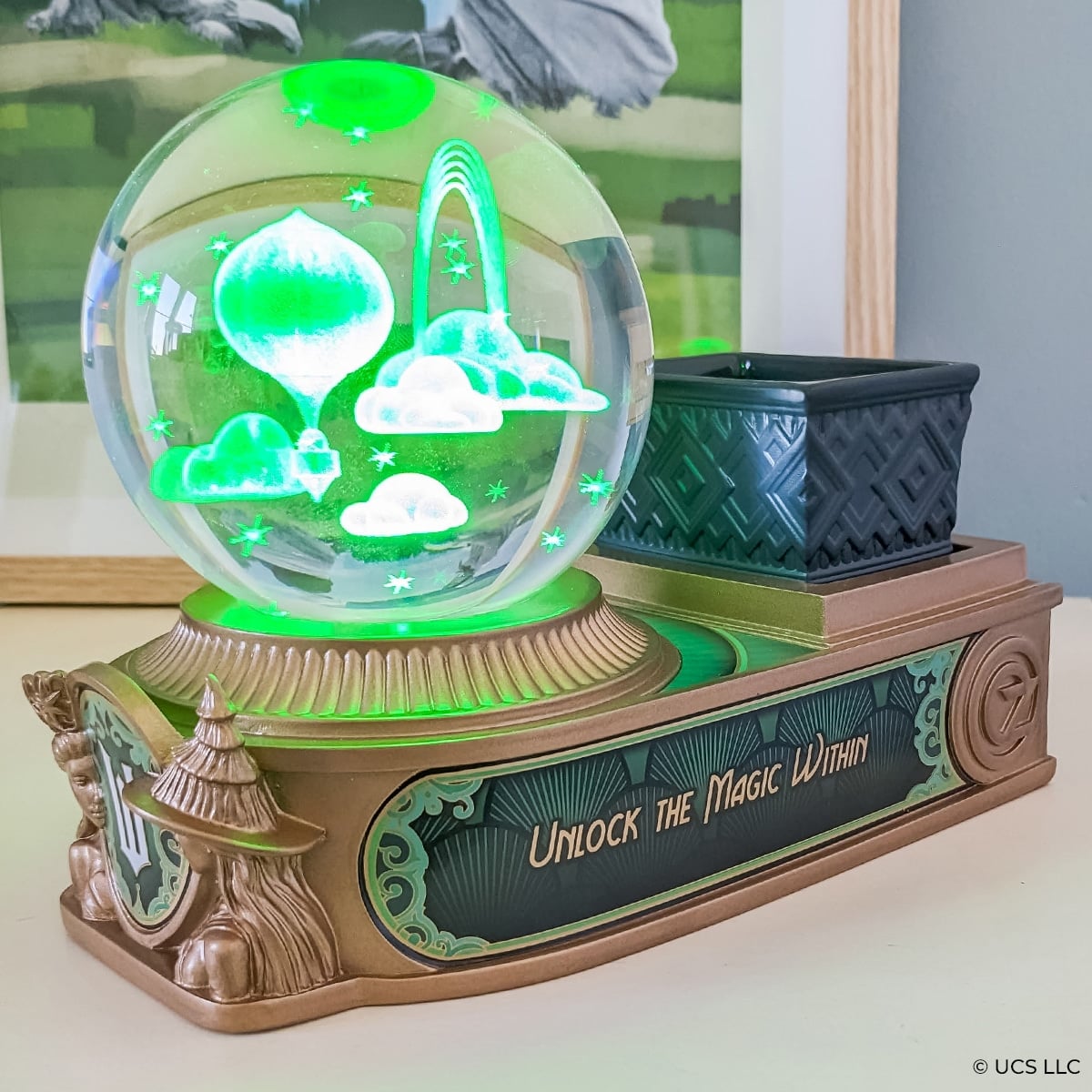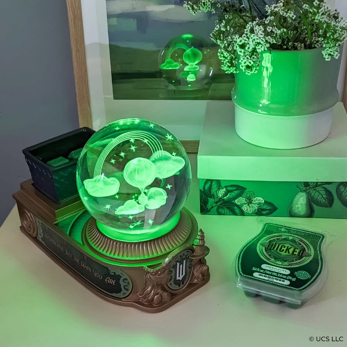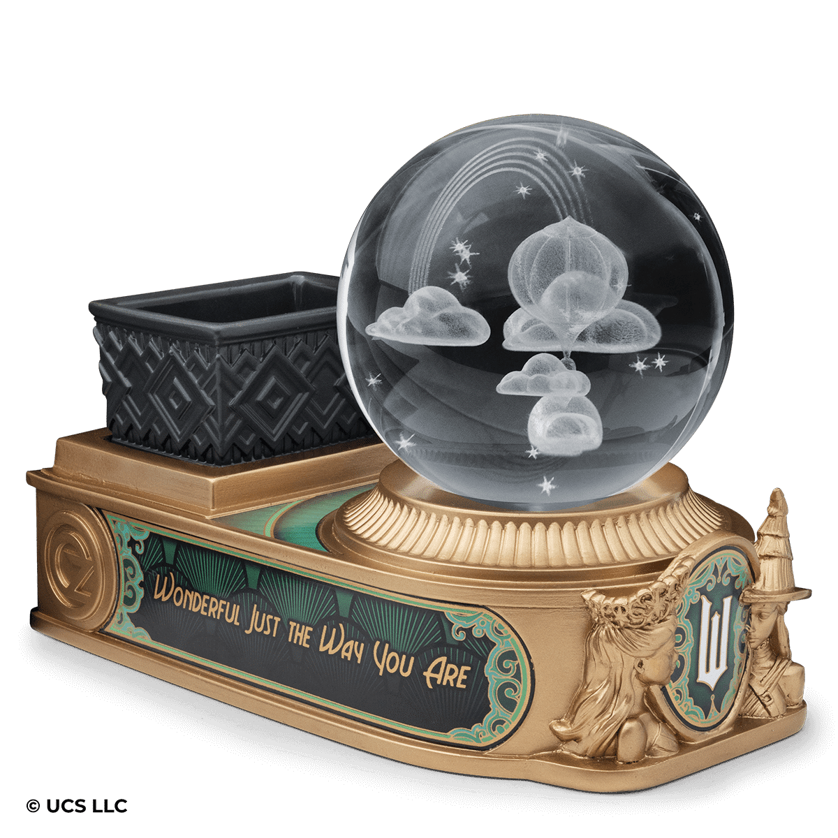 This enchanting warmer casts a mesmerizing green glow through its laser-etched glass orb when illuminated, bringing the magic of Wicked to life. Below, intricate depictions of Glinda and Elphaba in art deco style evoke the iconic Emerald City. Each side of the base includes a phrase that reflects the story’s dual perspectives, making this warmer a perfect tribute to a tale of two friends from opposite worlds.